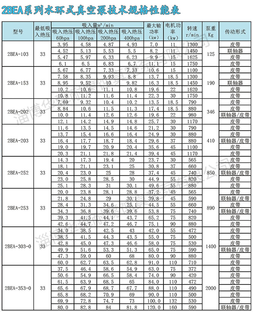 1、上列性能數據基于進氣溫度20%,進水溫度15℃,排氣壓力1013hpa,吸入介質為飽和空氣的條件。